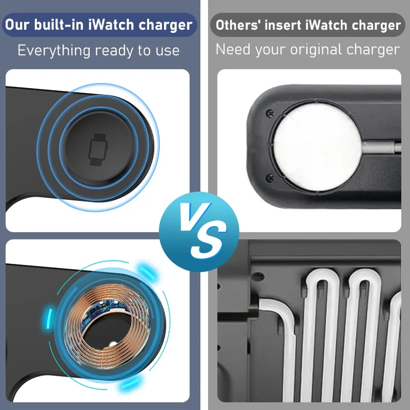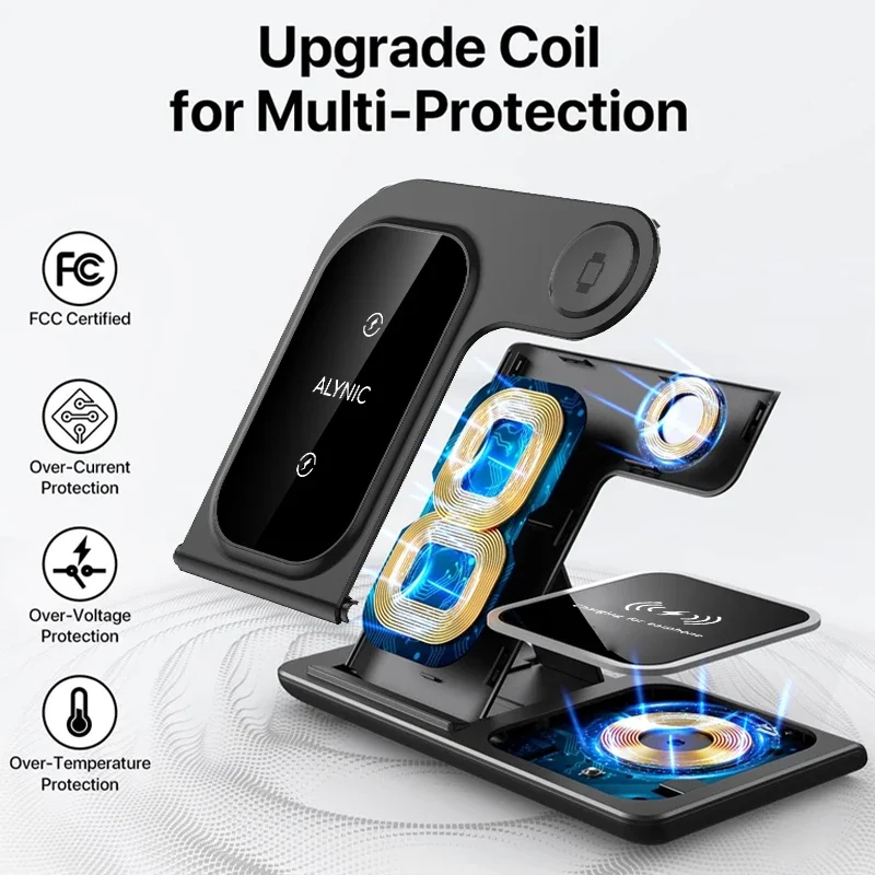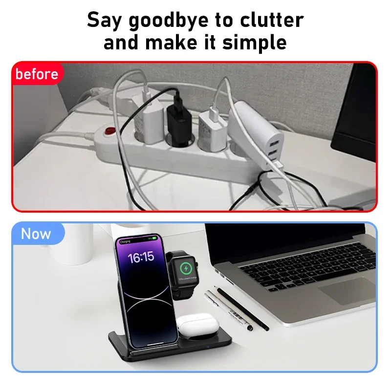 Carregamento Triplo Sem Fio: Carregue até três dispositivos ao mesmo tempo (telefone, relógio e buds), eliminando a necessidade de múltiplos cabos e carregadores.