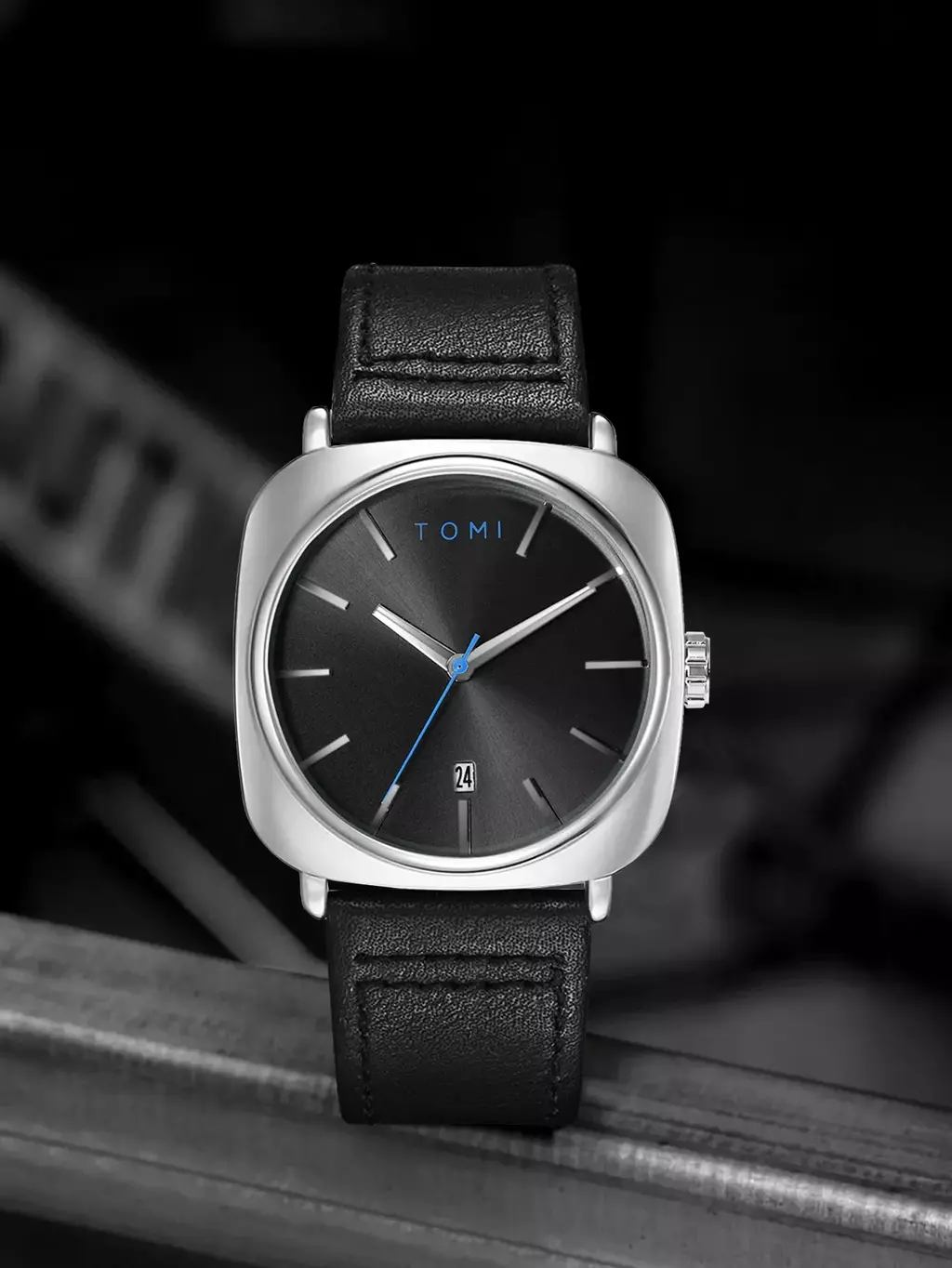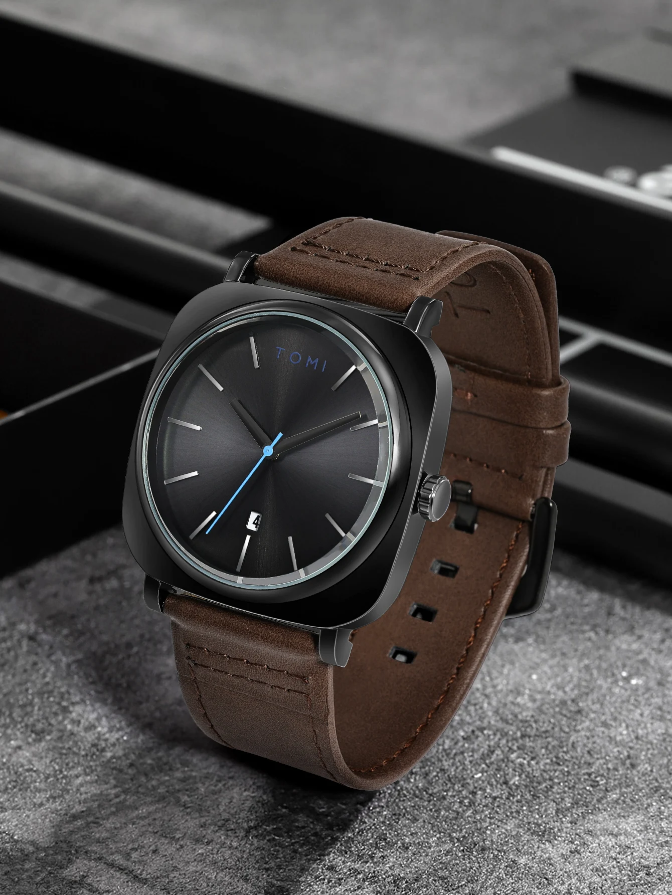 Relógio de Design Clássico-Moderno: Apresenta uma caixa de formato quadrado/almofadado e um mostrador limpo e escuro, com pulseira de couro (preta). Um clássico atemporal que adiciona presença ao pulso.