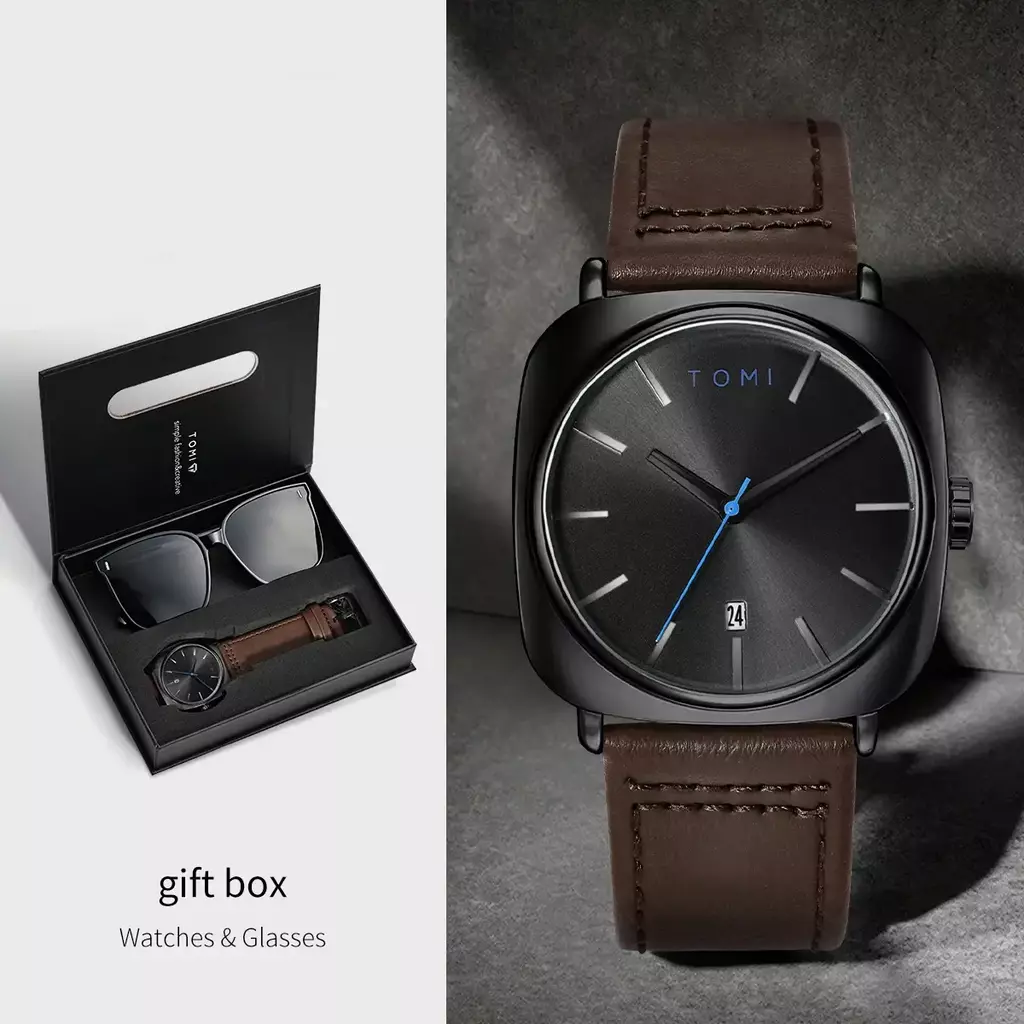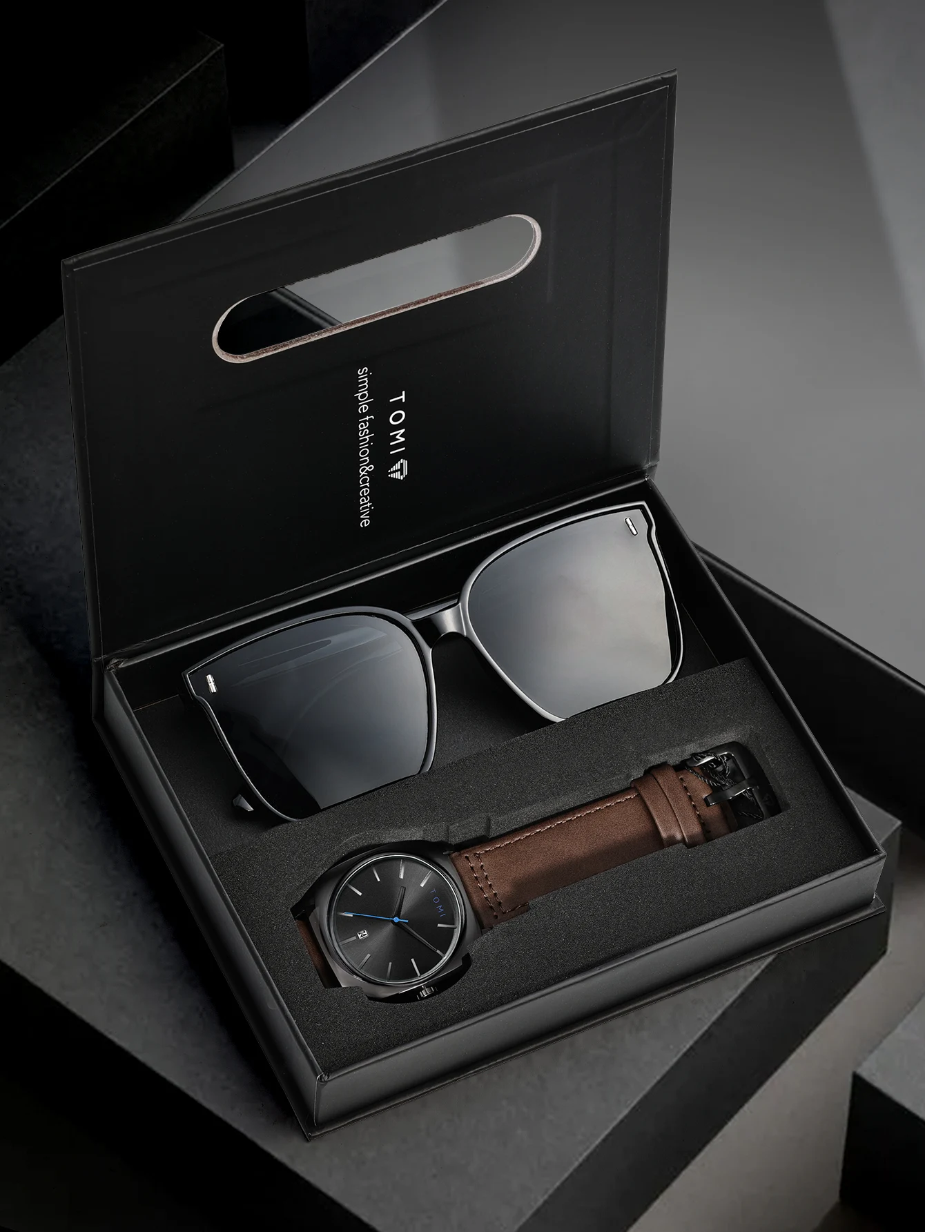 O Kit Essencial Gentleman da ZOLTAN é a solução definitiva para o homem que busca acessórios de alta qualidade e design coordenado. Este conjunto TOMI combina a elegância discreta do relógio de formato único com a proteção e o estilo dos óculos de sol, tudo apresentado em uma embalagem de presente premium.