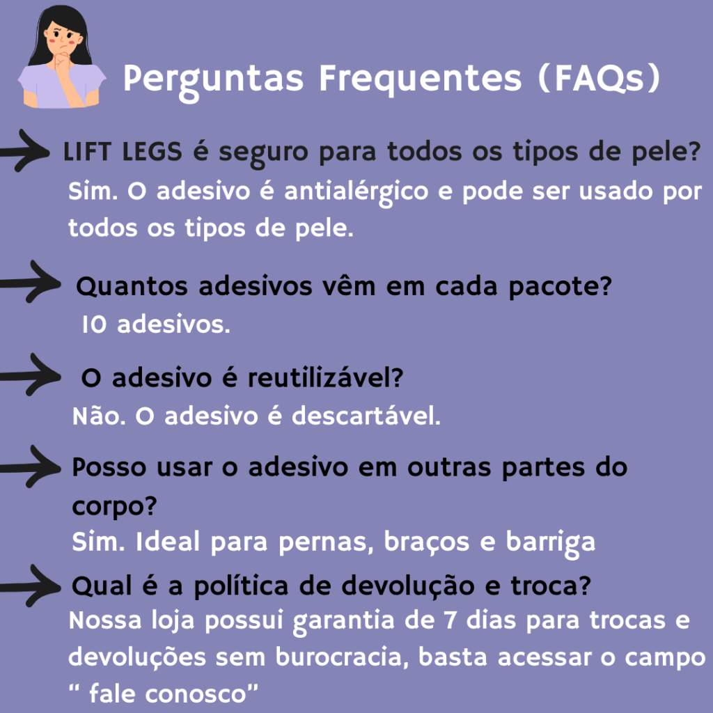 Fácil de Usar e Discreto: Lift Legs é fácil de aplicar e pode ser usado discretamente sob qualquer tipo de roupa, permitindo que você desfrute de seus benefícios sem preocupações.