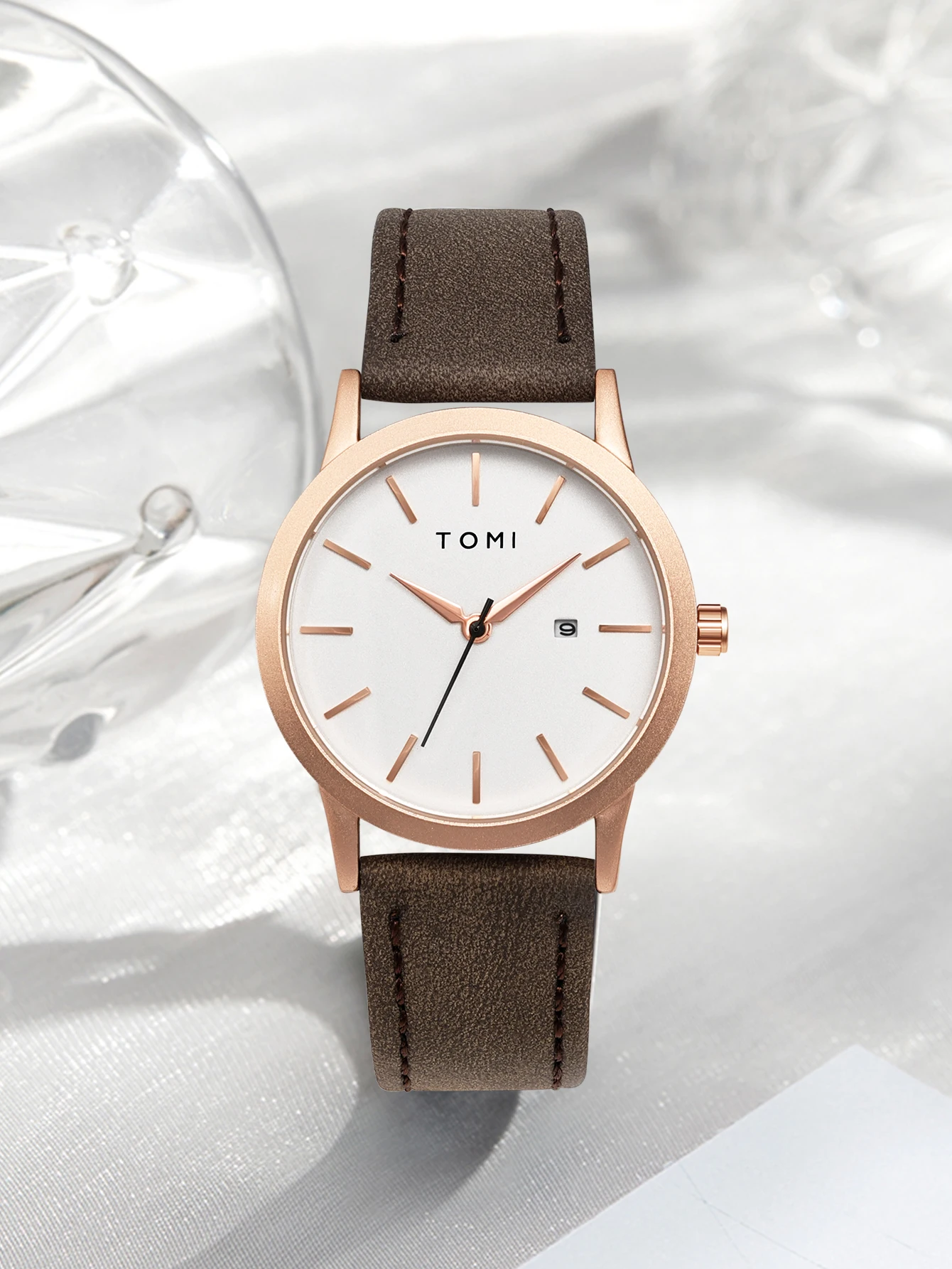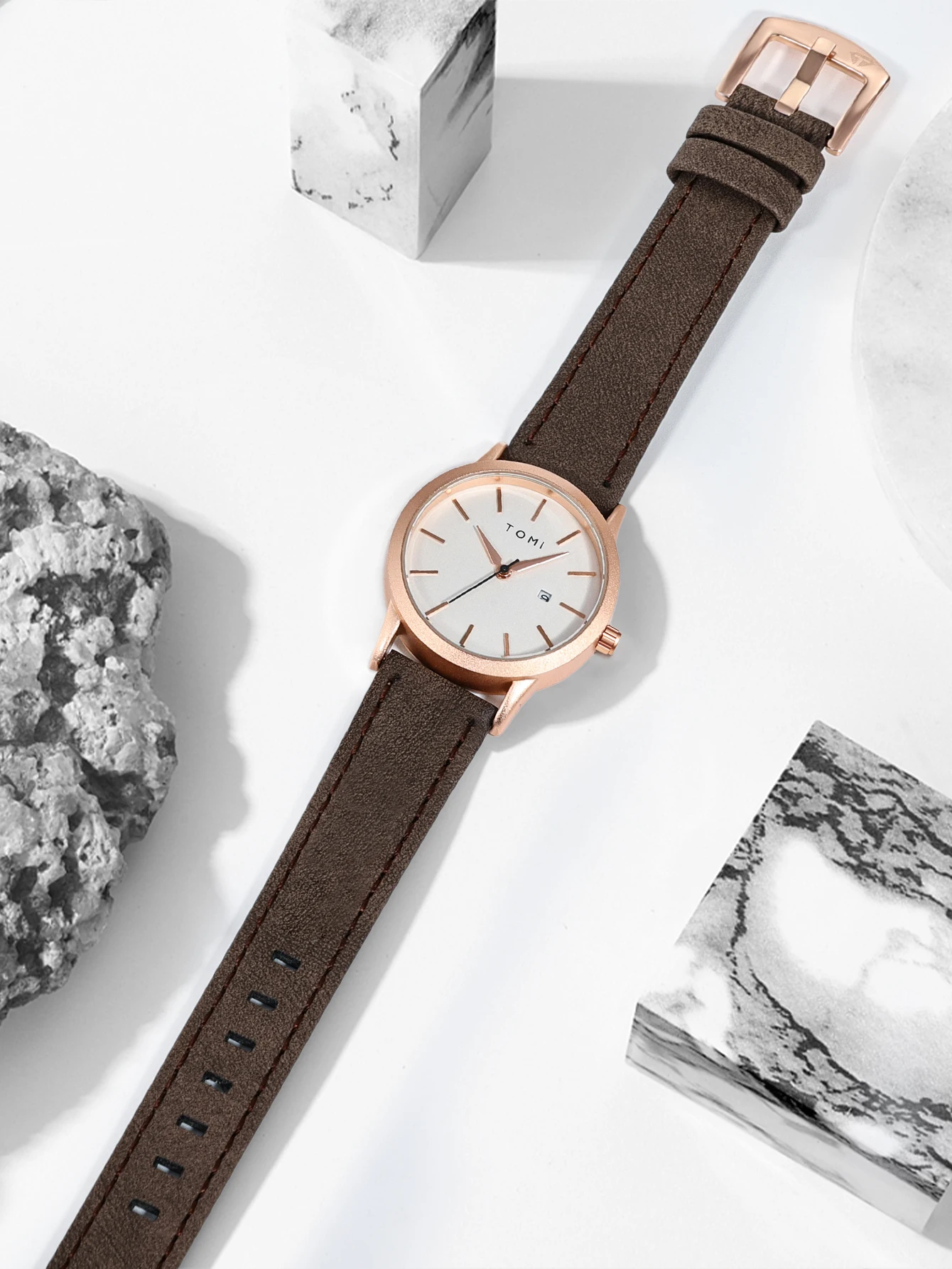 Pulseira de Couro Confortável: A pulseira de couro (tom marrom) com costuras elegantes proporciona conforto no uso diário e um toque clássico.