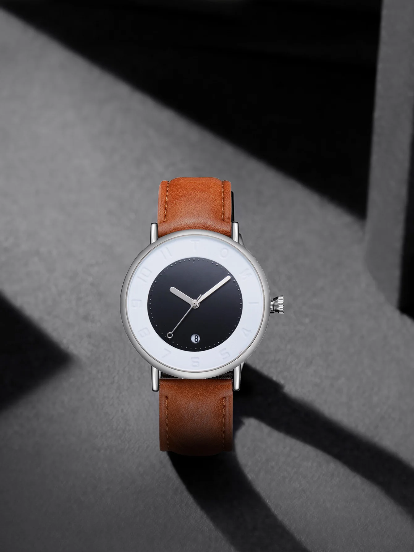Estilo Casual Elegante: A combinação de caixa metálica e pulseira de couro marrom com costura em destaque cria um visual casual luxuoso de fácil combinação.