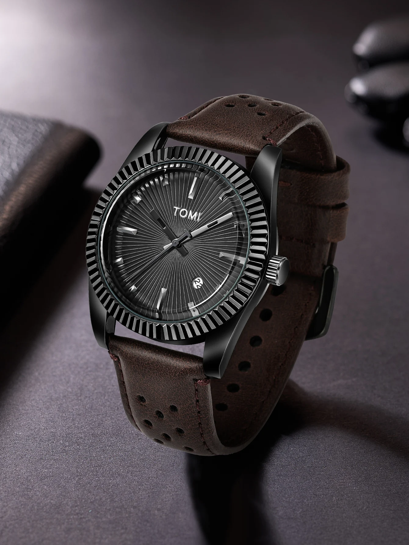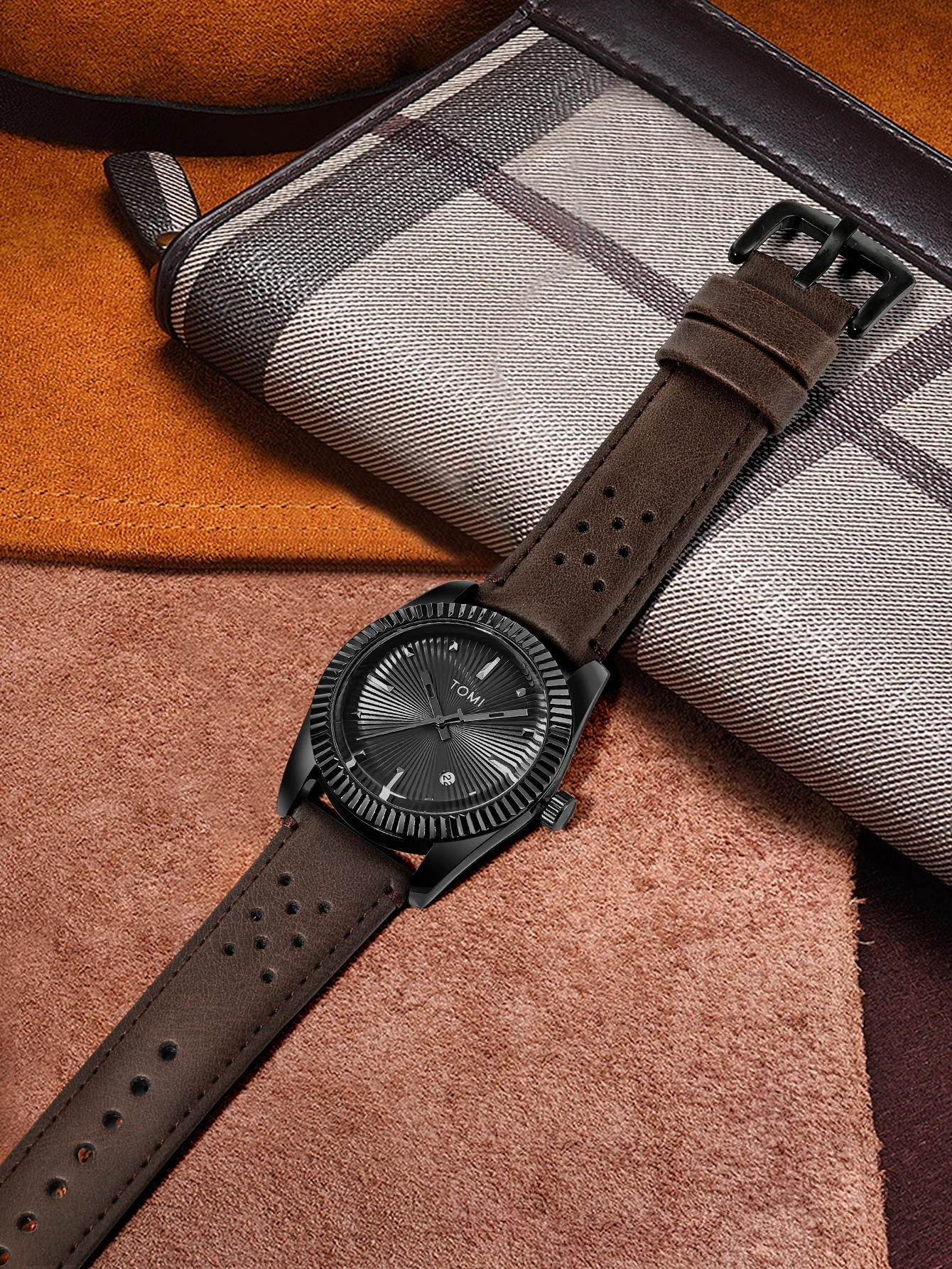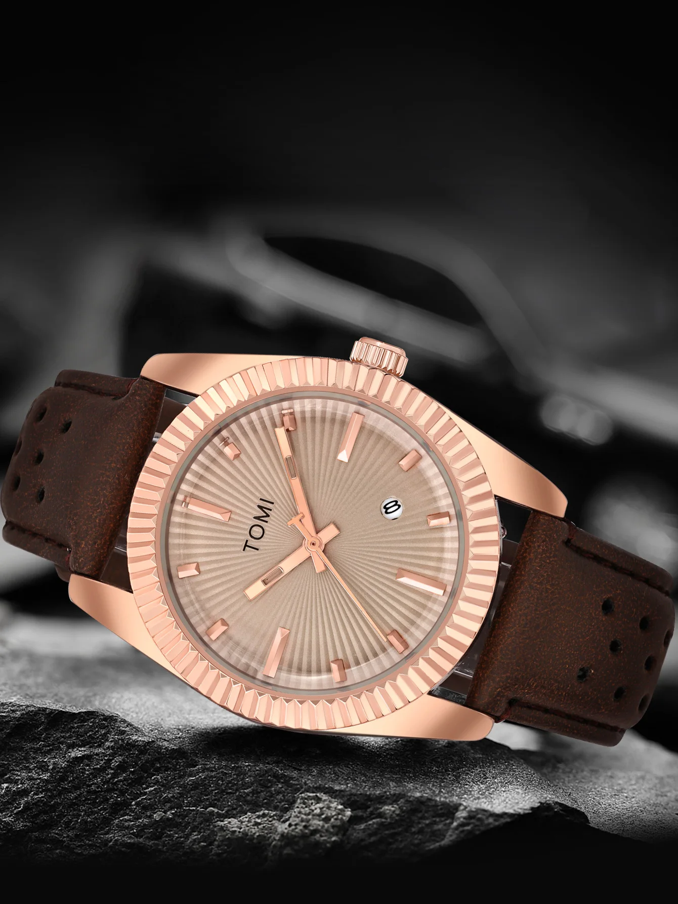 O Relógio TOMI Sport Classic da ZOLTAN é para o homem que aprecia a beleza do design tradicional com uma pegada forte e contemporânea. Inspirado em relógios clássicos, ele se destaca pela sua moldura canelada (fluted bezel) e pelo mostrador com efeito sunburst (raiado), que captura a luz de forma espetacular.