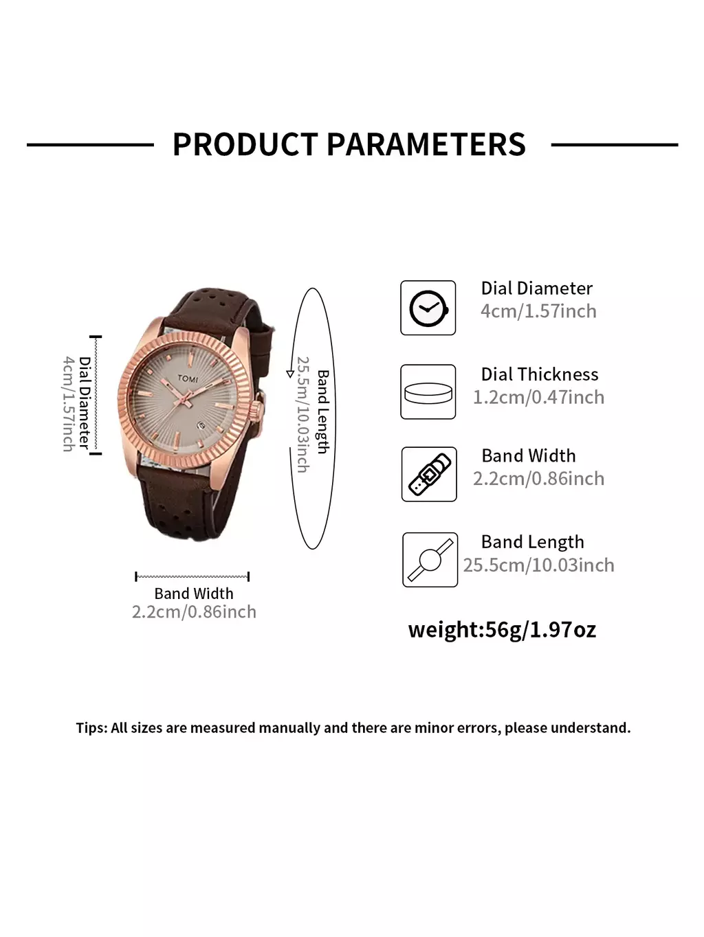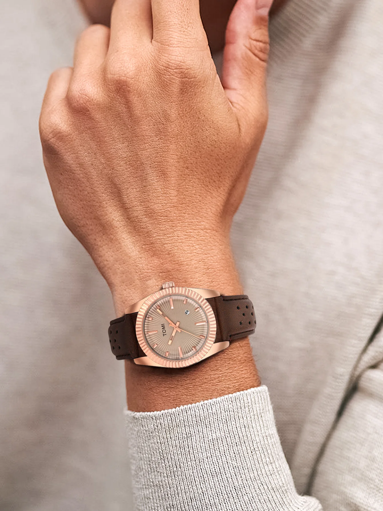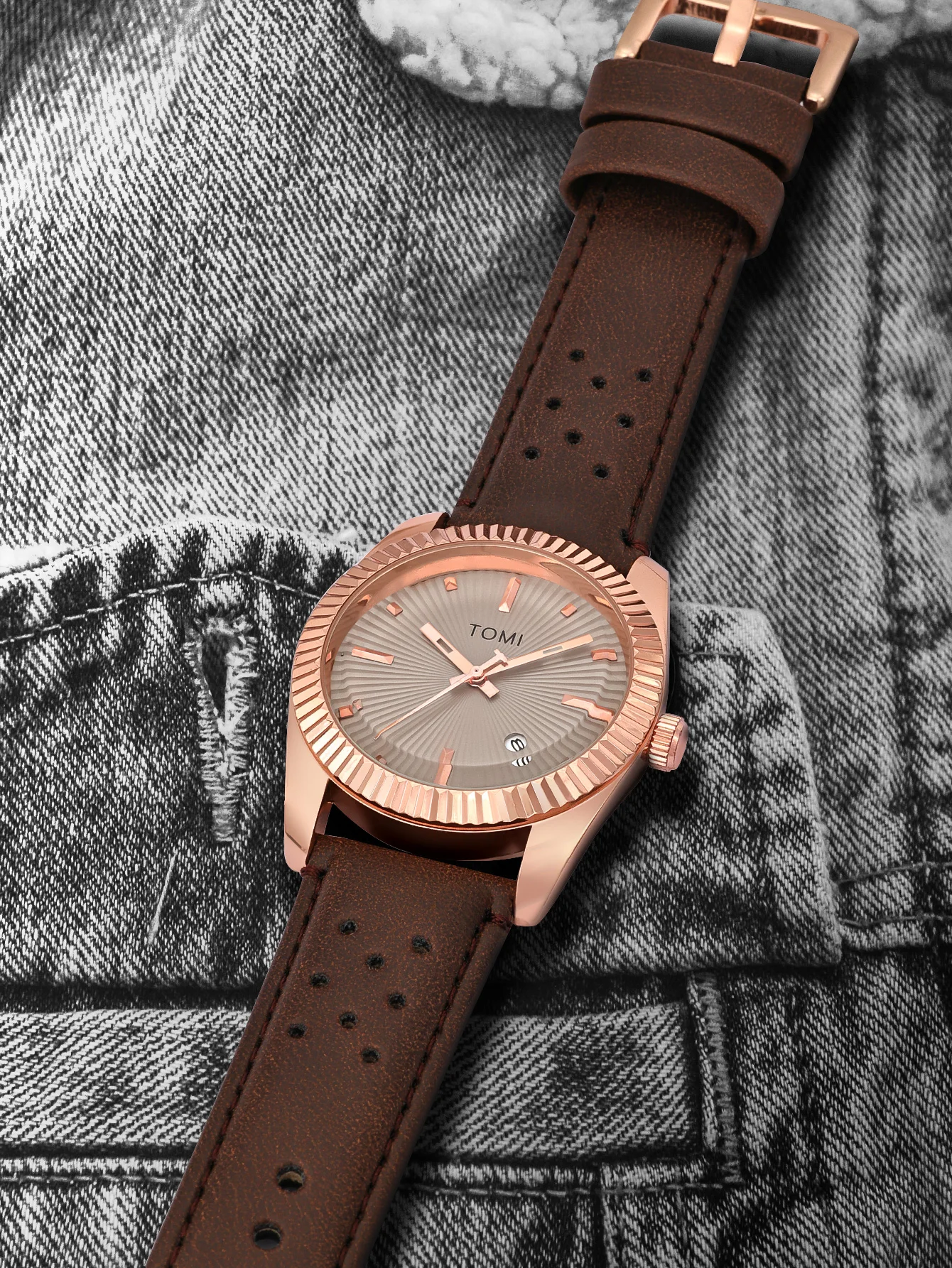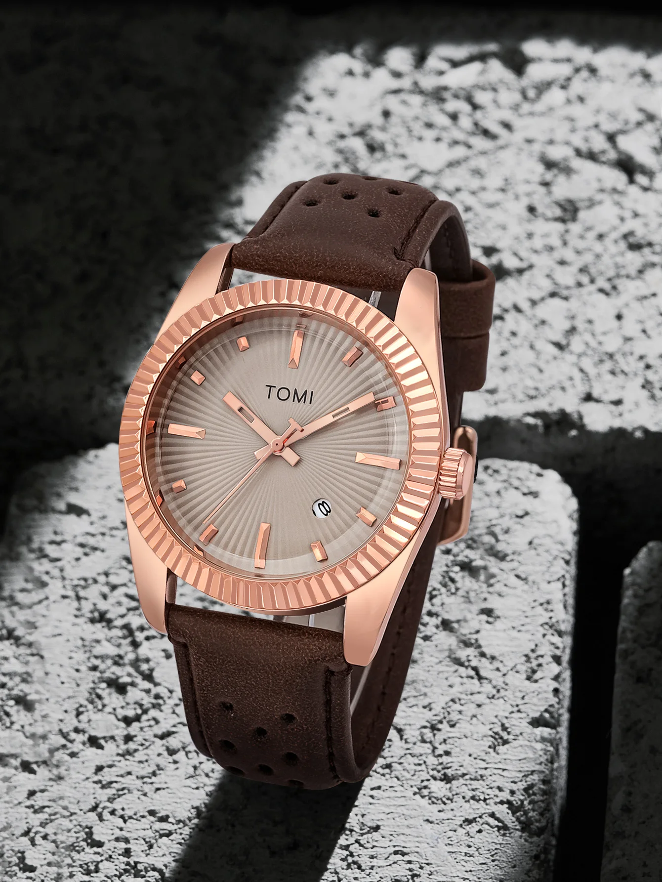 O Relógio TOMI Sport Classic da ZOLTAN é para o homem que aprecia a beleza do design tradicional com uma pegada forte e contemporânea. Inspirado em relógios clássicos, ele se destaca pela sua moldura canelada (fluted bezel) e pelo mostrador com efeito sunburst (raiado), que captura a luz de forma espetacular.